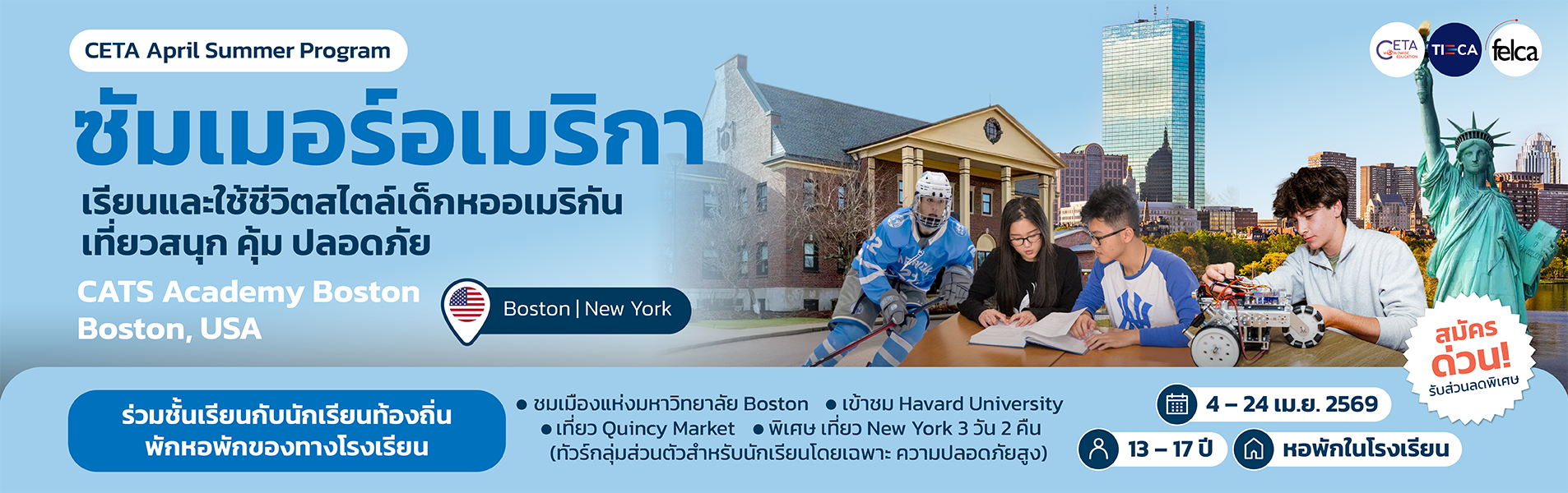 CATS Academy Boston เป็นโรงเรียนมัธยมแบบ Day & Boarding ตั้งอยู่ใกล้เมืองบอสตัน ประเทศสหรัฐอเมริกา โรงเรียนใช้หลักสูตรสหรัฐอเมริกาเพื่อเตรียมความพร้อมสู่มหาวิทยาลัยชั้นนำ พร้อมแคมปัสทันสมัย ครอบคลุมกว่า 20 เอเคอร์ และหอพักที่สะดวกสบายสำหรับนักเรียนจากกว่า 35 ประเทศ ที่นี่จึงเป็นทั้งสถานที่เรียนรู้ที่เข้มข้นและ “บ้านหลังที่สอง” ที่อบอุ่น โรงเรียนเน้นพัฒนาทั้งความรู้และทักษะชีวิต ผ่านชั้นเรียนขนาดเล็กและการแนะแนววิทยาลัยส่วนบุคคล เพื่อให้นักเรียนทุกคนพร้อมสู่เส้นทางมหาวิทยาลัยในฝัน
